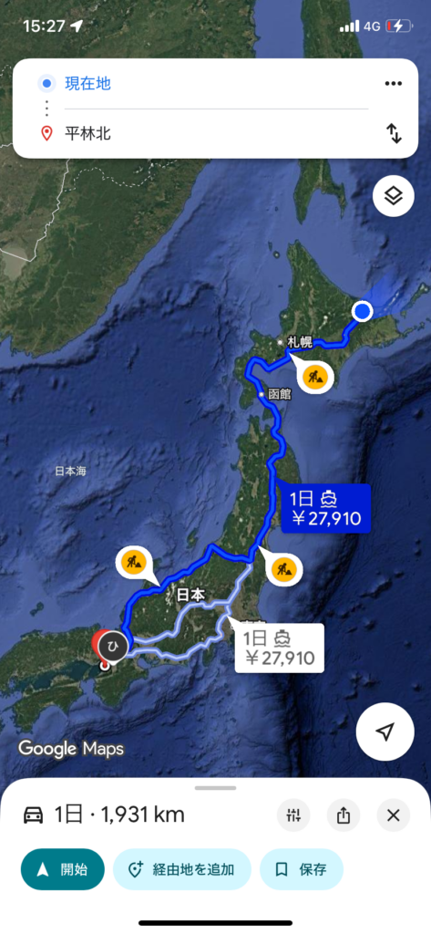 とりあえずざっくりとGoogleマップで調べたらこんな感じでした。引き取り場所は道東にある美幌町というところで、フェリーに乗るための函館に着くまでに約600km。恐るべし北海道、、、